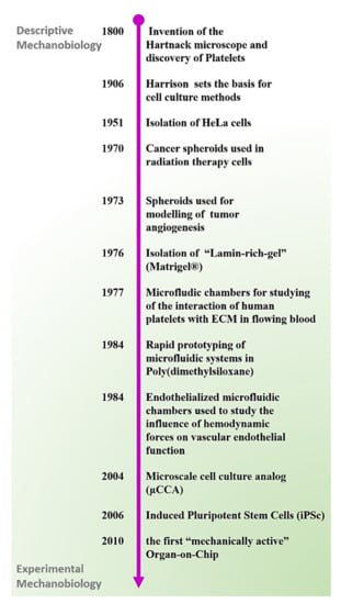 The emerging concept of microengineering organ-function in vitro (a steppingstone for OOCs) via culturing of human cells in a controlled and dynamic microenvironment builds on important milestones that mark the history of mechanobiology. Here, we describe and comment on some of the most remarkable scientific achievements that, in our opinion, signed the transition of mechanobiology from a descriptive field to an experimental science and paved the way toward the modern concept of Organ-on-Chip.