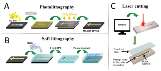 Typical fabrication techniques used for generating microfluidic constructs for Organs-on-Chips. Schematics capturing the main steps in (A) photolithography, (B) soft lithography and (C) laser cutting. Reproduced with permission from [] and under Creative Commons license from [].