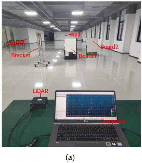 Based on the above, the ranging experiment was implemented to demonstrate the imaging capability of the MEMS LiDAR system and verify the feasibility of the MEMS mirror synchronization method. When the synchronization signal of the MEMS mirror pair is given, the LiDAR system starts to work. In this experiment, a 2D point cloud image covered a 60° FOV and consisted of the wall, corner, two boards, and the bracket, as shown in Figure 9. Board 1, with a size of 0.6 m × 1.2 m, was placed approximately 5.6 m in front of this MEMS LiDAR; board 2 (0.6 m × 1.2 m) was placed at approximately 7.4 m, the bracket (with a 3 cm thickness) was placed at approximately 4.1 m, the corner was situated at about 21.1 m, and the wall was situated at approximately 37.9 m. Figure 9a shows the scene of the experiment, Figure 9b shows the panorama of the cloud point, and Figure 9c shows the cloud point details, regarding board 1, board 2, and the bracket. From the experimental results, the MEMS mirror synchronization method can be proved.