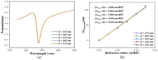 In the ORRS structure, the first thing to study is whether the position and the size of stub-2 affect S and the FOM value. First, the position of stub-2 can be achieved by changing the size of the d parameter. The stub-2 structure with different ds, set to 333 nm, 343 nm, 353 nm, 363 nm, and 373 nm, was studied, while other parameter settings were the same as in Figure 2 (the values of parameters not mentioned in the following studies are the same as these). Its transmittance spectra and S-changing image are depicted in Figure 4a,b. Subsequently, the same operation was performed, but the value of l was increased from 200 nm to 300 nm, at 25 nm intervals, and a total of five sets of data were produced, to study the effect of stub-2 size on performance. The results are shown in Figure 4c,d. As plotted in Figure 4a, despite the difference of d, the images are coincident. This proves that different d values have the same transmittance and wavelength: the transmission is as low as 0.234 and λ = 1879 nm. As shown in Figure 4b, although the d value was changing, the sensitivity fitting curves basically coincide. There could have been a deviation of 1 nm at some points, resulting in a sensitivity change of 20 nm/RIU. These deviations have a negligible effect on performance. According to Formula (4), when T and are the same, the FOM value is also the same. The result of the analysis of l is the same as that of d: its transmission is 0.216 nm, λ = 1880 nm, and different l values have the same S and FOM. Based on such results, we can exclude the interference of d and l when studying the influence of other parameters on system performance.