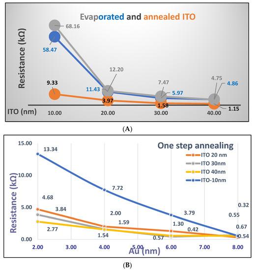 Figure 4B,C depicts the resistance variation in annealed ITO/Au coverslips coated with different ITO/Au films when using the one-step and two-step annealing protocols. Similar behaviors are observed for both thermal treatments with a decrease in the resistance values versus increases in ITO and Au thicknesses from 10 to 40 nm and from 2 to 8 nm, respectively. Moreover, the resistance values are always higher at a given gold thickness and for the lowest ITO thicknesses.