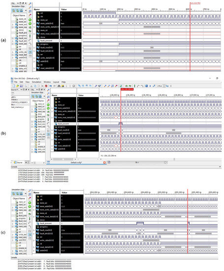 The simulation results of the proposed BISR block are shown in Figure 6. The memory is packed with the 0s at w0 state, as shown in Figure 6a, and reading operations start from the third state and will continue till the seventh state and are shown in Figure 6b,c. Every time-read datum is compared with the desired pattern mentioned in the algorithm, and if the failure occurs, the false information is written into a fail information state. With this failure information, the BIRA prepares a repair strategy and provides a repair solution for the memory under test.