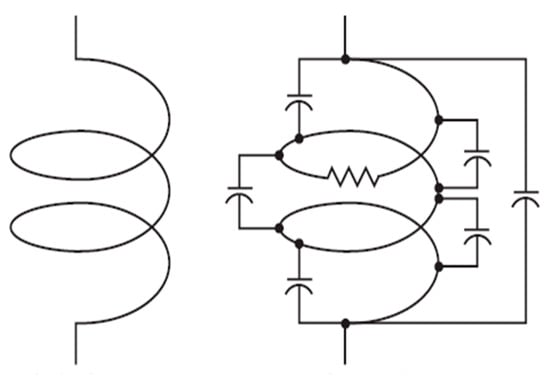 Coil: ideal inductor (left), inductor with stray capacitance and resistance (right).
