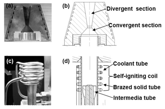The ICP torch under investigation. (a) De-Laval nozzle photo; (b) CAD model: cross section of the nozzle; (c) photo of the self-igniting coil and intermediate tube; (d) CAD model: cross section of the torch.