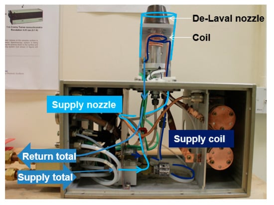 The authors calculated the value of the total power dissipated by the coolant channels for an 800 W RF power. The value was 390 W (see Section 4.2, Figure 10). The investigation highlighted that the power dissipated in the nozzle coolant was 124 W. On the other hand, the power dissipated by the coil coolant was 266 W.