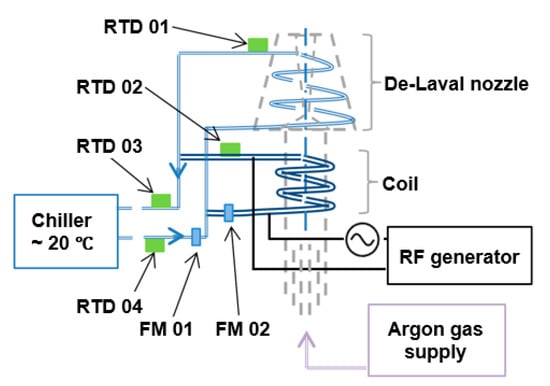 Figure 5 illustrates the coolant distribution, the instrumentation of the torch assembly, the locations of flow meter, the locations of the temperature sensors, the chiller unit, the RF generator, the coil, the nozzle and the gas supply. In Figure 5, the acronym RTD and FM stands for resistance thermal device and flowmeter, respectively. Section 3.2 and Section 3.4 provide detailed information about both coolant flow rate and temperature measurements, respectively.