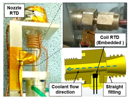 Resistance thermal devices (RTDs) type PT100 class A (OMEGA Engineering, Manchester, UK) and a data acquisition (CompactDAQ) system (National Instruments, Austin, TX, USA) were used for temperature measurements and recording the data. All RTDs were calibrated in both icy water (0 °C) and boiling water (100 °C), respectively. The nonlinearity correction parameter determined was 0.385% per 100 °C. The RTDs were secured at key locations to measure the coolant temperatures of both inlet—supply total—outlet—return total—coil outlet and nozzle (Figure 5 and Figure 6 left). The instrumentation was carried out using a straight fitting mounted on the end of the coil (Figure 6, right). The RTD sensor was immerged in coolant.