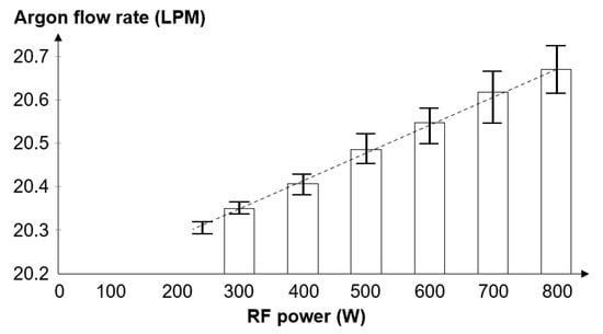 The live value of the main gas flow was measured experimentally because a departure from nominal value was observed. These results (Figure 7) were obtained through a series of six experiments for which RF power was ramped up using 100 W steps. Recorded values showed an increase of 0.7 LPM for 800 W RF power. The mean deviation from the nominal gas flow was within 3.5%.