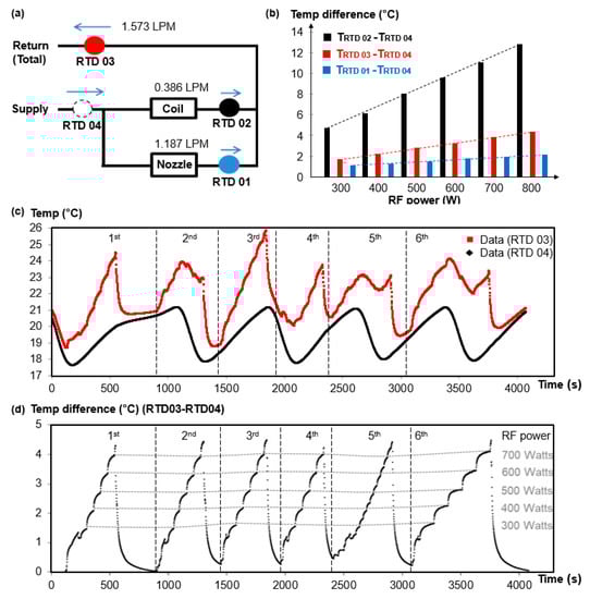 Schematic of coolant circuit and the temperature measurement data. (a) RTDs were positioned at four key points of the coolant circuit; (b) temperature difference of coolant channels: coil, nozzle and total; (c) original temperature reading logged from the RTD 03 and 04; (d) temperature difference between RTD 03 and 04.