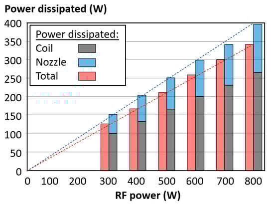 Figure 10 enables one to highlight that a near linear correlation exists between RF power values and both TD and power dissipated values for the range 300 W up to 800 W. The measured power dissipation from the sum of the coil and nozzle is higher than the measured power dissipation from the total channel, which is attributed to a constant amount of heat transferred through the coolant pipe. Two valuable formulas can be achieved from Figure 10: (1) power dissipation from coolant through both coil and nozzle, i.e., Powercoil+nozzle = 0.488 × RF power; (2) the power loss from the coolant pipe = Powercoil+nozzle − Powertotal = 0.063 × RF power.