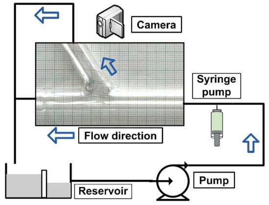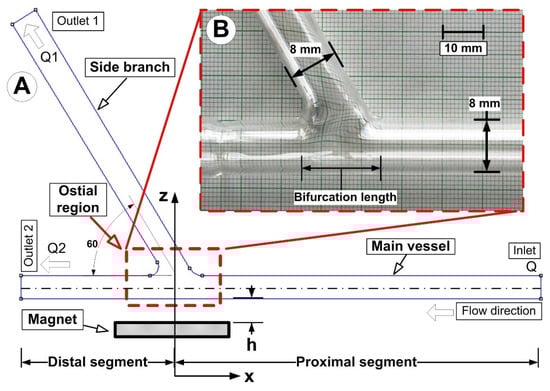 The artery bifurcation model was fed with a flow of carrier fluid (a water-glycerin combination) by a computer-controlled centrifugal pump (from the German company GAMPT mbH, Merseburg, Germany) (Figure 1). The test section, made from glass tubing with a 110 mm long proximal segment and a 70 mm long distal segment, was an arterial bifurcation with a bifurcation angle of 60° (Figure 5). The main flow was adjusted to 0.12 m/s, giving a flow rate of Q = 362 mL/min corresponding to Reynolds number of Re = 281. Before the flow entered the intake portion of the bifurcation model, the magnetic particles (Fe particles) were discharged into a continuous laminar main flow for 30 s. A permanent magnet was positioned in various vertical locations in the artery bifurcation to provide the necessary magnetic field. According to Equation (6), the shear rate, γ, for an 8 mm tube is 15 s−1 (assuming laminar flow):