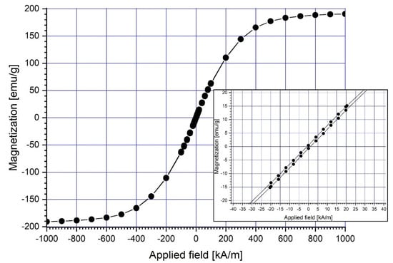 At ambient temperature (22 °C), a vibrating sample magnetometer (VSM 880-ADE Technologies, Pensacola, FL, USA) with a field range of 0 to 950 kA/m was used to assess the magnetic characteristics of the magnetic carrier (Fe particles) (Figure 3). Table 2 displays the overall findings of the Fe magnetic characteristics.