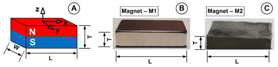 Permanent magnets used in this study. (A) Dimensions, axis association, and polarization direction. (B) Magnet M1—Neodymium-type magnet with grade N52. (C) Magnet M2—ferrite-type magnet with grade Y35.