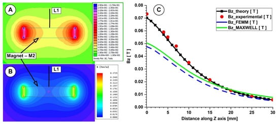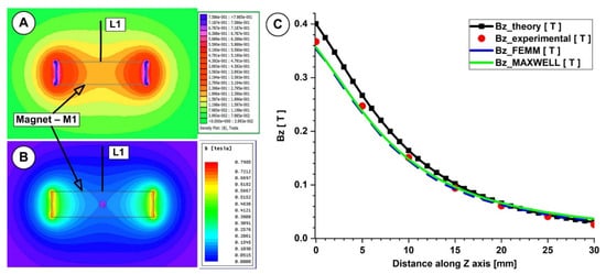 Theoretical and numerical investigations of the magnetic field generated by the magnet M1 (40×20×10 mm), type NdFeB grade N52. Numerical results: (A) using FEMM 4.2, (B) using Ansys Maxwell. (C) Bz evolution function of the magnet surface distance. Comparison between theoretical, experimental, and numerical results.