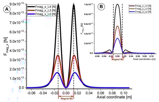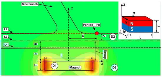 W—magnet width, L—magnet length, T—magnet thickness, Br—is the magnet residual flux density, and z—distance from the magnet surface (where z ≥ 0) on the magnet’s centerline.