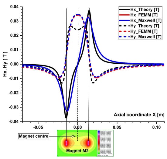 As shown in Table 5, for the neodymium N52 permanent magnet, the B-field values obtained analytically agree well with the values obtained from the experimental and numerical investigations (for both used numerical software), and the percentage differences are around 10%. However, in the case of the ferrite Y35 permanent magnet (Table 6), we have a consistent difference between the numerical and analytical results. In our opinion, the difference between the theoretical and experimental values in both situations is due to the spatial position of the gaussmeter hole.