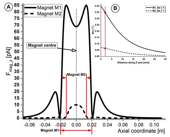 A theoretical study for the magnetic field distribution around a rectangular permanent magnet (Equation (5); []) was used to compare the magnetic field distribution produced by the studied permanent magnets: