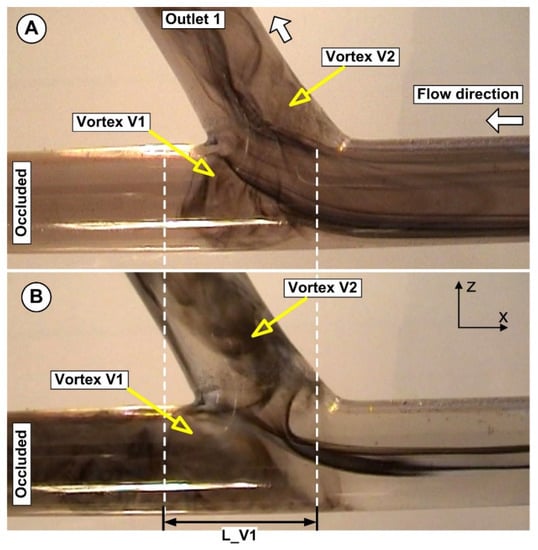 Figure 16A,B and, respectively, Figure 15(B2) demonstrate how the build-up of particles alters the structure of the fluid flow in the target area by accelerating the fluid on the surface of the particle deposition, decreasing the flow section, and changing the size and location of the primary recirculation (vortex V1).