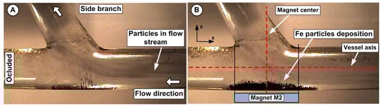 The size of the utilized particles is significantly greater than that of the drug delivery particles [,]. The practical selection of this kind of magnetic particle, which has a large diameter, was influenced by the findings of Pislaru et al. [], who investigated the endothelialization of 8 mm diameter synthetic vascular grafts (commercial Dacron grafts) using coated iron oxide particles with a diameter of 0.9 mm. However, because the size of this magnetic particle is like that of a red blood cell (7.5–8.7 μm), we chose to employ it.