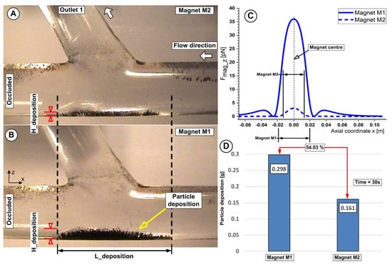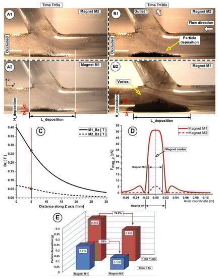For the investigated magnets, we can state that the maximum deposition is associated with a minimum distance between the magnet and the target area. Furthermore, in the case of both magnets, a consistent deposition of particles is obtained for the distance of 10 mm from the magnet surface (26.8% for the magnet M1 and 16.1% for the magnet M2, respectively) (Figure 16D). From our point of view, it is essential to mention that this efficiency refers only to the fact that a reasonable number of particles are captured from the total injected. This effectiveness needs to be interpreted by medical experts to devise a plan for obtaining the best deposition from the point of view of the intended treatment.