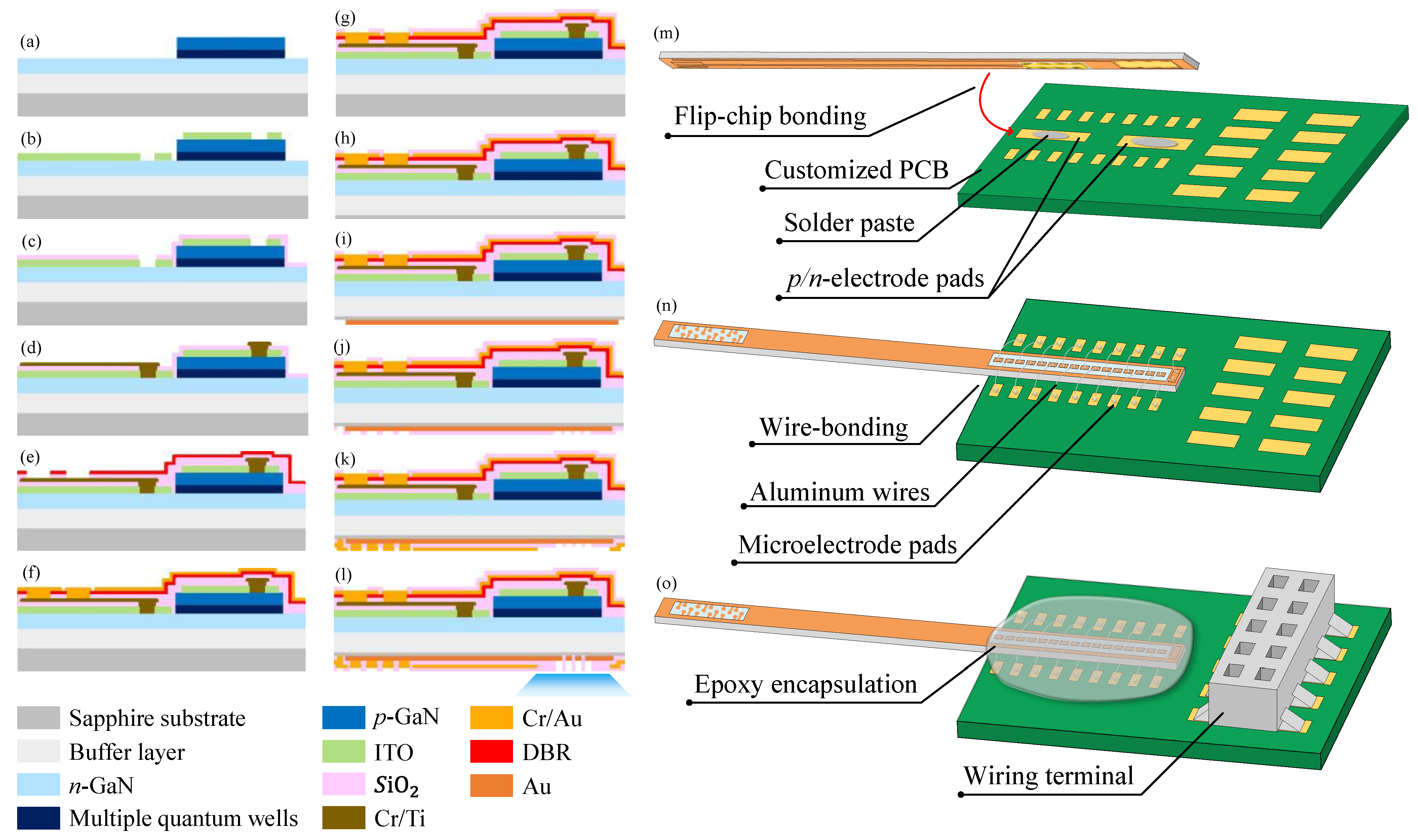 - Kim, K.; English, D.; Mckenzie, S.; Wu, F.; Stark, E.; Seymour, J.; Ku, P.C.; Wise, K.; Buzsaki, G.; Yoon, E. GaN-on-Si μLED optoelectrodes for high-spatiotemporal-accuracy optogenetics in freely behaving animals. In Proceedings of the 2016 IEEE International Electron Devices Meeting (IEDM), San Francisco, CA, USA, 3–7 December 2016. [Google Scholar]