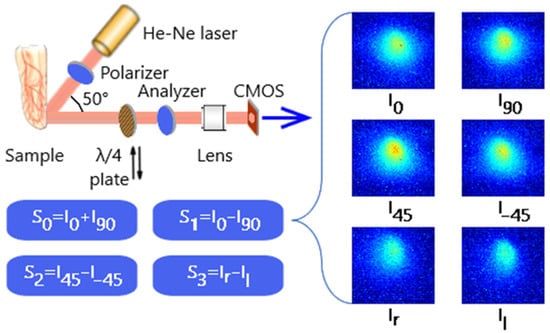 The files obtained as a result of the experiment are further processed using the developed script written in the MATLAB software (MATLAB 9.7, MathWorks, Natick, Massachusetts, USA). The program reads files from folders and calculates the parameters of the Stokes vector , , , for each image pixel according to the matrix expression [,]: