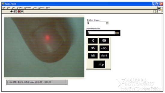 The registration and primary processing of the coordinate distributions of irradiance on a matrix photodetector were carried out using the software developed in the LabVIEW (12.0.0, National Instruments, Austin, Texas, USA) environment, the main window of which is shown in Figure 2.