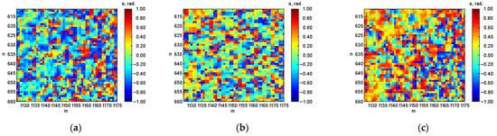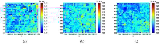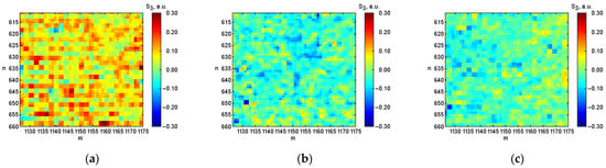 After digital image processing, the visualization of the coordinate distributions of the Stokes vector parameters , , (Figure 3, Figure 4 and Figure 5), the polarization state parameters , , (Figure 6, Figure 7 and Figure 8) of the output radiation for four series of the experiment and constructed their corresponding histograms were performed. The figures show a sample (50 × 50) of the proximity of the found combined energy center of the spatial images of the radiation intensity distributions.