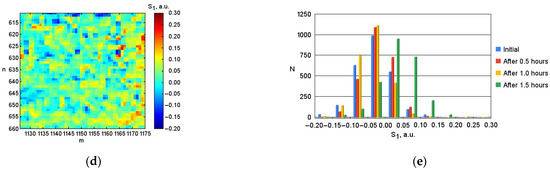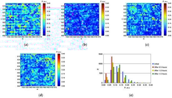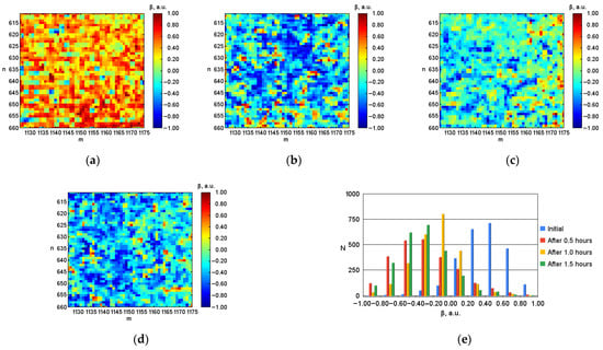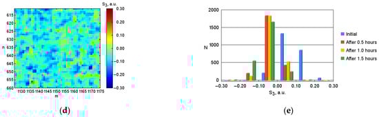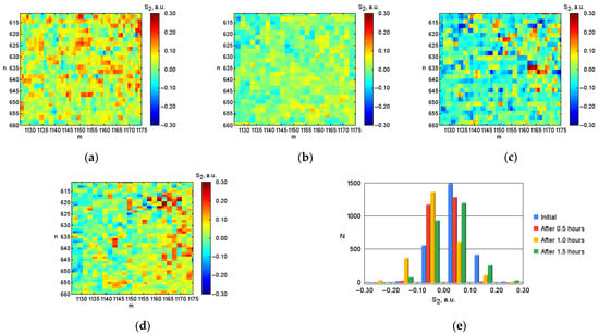 Coordinate distributions of the parameter of the Stokes vector , where: (a) is the initial hematocrit level; (b) is the hematocrit level after 0.5 h; (c) is after 1.0 h; (d) is after 1.5 h, and (e) the corresponding histograms of the object under investigation.