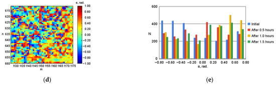 Coordinate distributions of the polarization ellipse (azimuth) , where: (a) is the initial hematocrit level; (b) is the hematocrit level after 0.5 h; (c) is after 1.0 h; (d) is after 1.5 h, and (e) the corresponding histograms of the object under investigation.