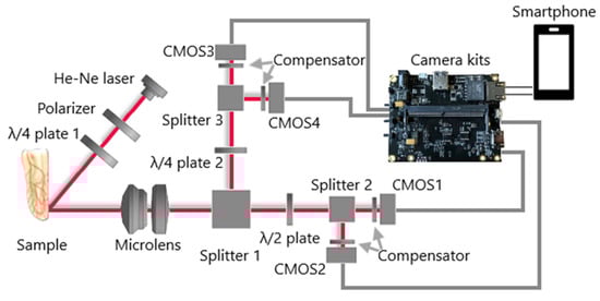 The transmitting unit contains a source of optical radiation (He-Ne laser) and miniature optical elements (polarizer and λ/4 plate 1) for the formation of a given state of polarization of radiation probing biological tissue. The channels of the receiving unit contain optical elements (micro lens; three splitters; λ/4 plate 2; λ/2 plate; compensators) for the formation and registration of four irradiance distributions on four matrix photodetectors (CMOS1-4). The scheme implements the following orientation of the anisotropic axes of the polarizing elements: the fast anisotropic axis λ/2 plate is oriented at an angle of 22.5 degrees, and the axis λ/4 plate 2 is oriented at an angle of 45 degrees to the selected plane containing the direction of beam propagation (plane of reference).