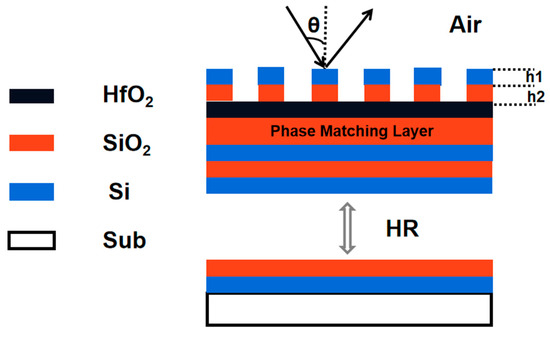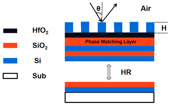 The etch stop layer is selected as HfO2 film with a refractive index of 1.8600. The grating is composed of silicon-based material (Si and SiO2) for practical processing procedure, which could be easily etched by the same Inductive Coupled Plasma (ICP) etching recipe. These two layers of materials form an equivalent material with adjustable refractive index, which gives additional dimension to adjust both the DE and the working spectrum range. The total structure is demonstrated as shown in Figure 1.