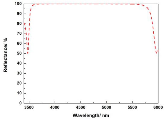 The first purpose of the reflective grating in this paper is to design a suitable DBR. Multilayer dielectric high-reflection films with a center wavelength of 4.7 μm on the surface of the substrate using high and low refractive index dielectric materials with good refractive index matching are designed to deposit alternately. For 100% reflectivity, theoretically, the larger the coefficient of the reflective film stack, the higher the obtained reflectivity. However, as the number of film layers increases, the accumulated stress inside the film stack increases, and the device is more prone to physical damage, resulting in unstable device usage. The film system design parameter requirements of this high-reflection film are shown in Table 3.