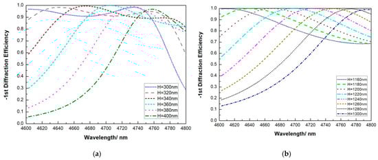 First-order DE versus wavelength with pure Si grating when the grating depth H changes (a) from 300 nm to 400 nm and (b) from 1160 nm to 1300 nm.