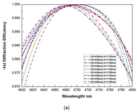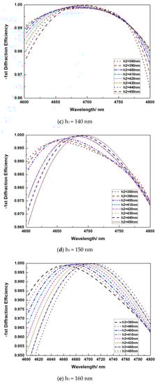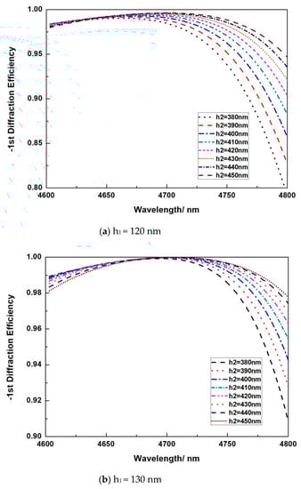 From these simulations, we picked up some lines when h1 is selected at 140 nm ± 10 nm and h2 is selected at 440 nm ± 10 nm, as shown in Figure 6. It can be see that, when the height of SiO2 h2 is selected at 140 nm ± 10 nm and the height of Si h1 is selected at 440 nm ± 10 nm, the highest DE around 4.7 μm reaches 99.99%, and the overall DE from 4.6 μm to 4.8 μm can reach over 96%. Notice that this ± 10 nm fabrication error is large enough that it can be easily controlled in experiment. Especially for conditions that are not so close to the largest error, suppose the total height of SiO2 and Si are within 570~580 nm, the overall DE from 4.6 μm to 4.8 μm can reach over 97%. Moreover, when h1 = 140 nm and h2 = 440 nm, the overall DE from 4.6 μm to 4.8 μm can reach over 97.88%. In this condition, the working spectrum (minimum DE > 96%) for high-power beam combining reaches for over 200 nm, at least four times larger than that of a pure Si grating. This DE is also higher than that of a metal grating, and since there is no absorption loss, the high-power laser damage threshold would be better. Notice that the total etching depth for h1 + h2 ≤ 0.6 μm is still smaller than half of the groove width (1.5 μm). This total height can be easily etched by one procedure of ICP.