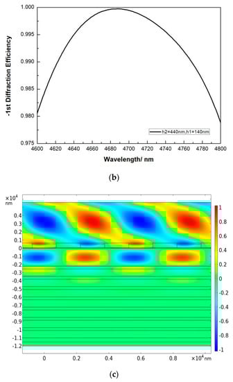 Relationship between the DE versus wavelength, at (a) h1 = 140 nm ± 10 nm and h2 = 440 nm ± 10 nm and (b) h1 = 140 nm and h2 = 440 nm. (c) Electric field distribution profile for four periods of the incident wavelength at 4.7 μm, 51.57° incident angle, at h1 = 140 nm and h2 = 440 nm.