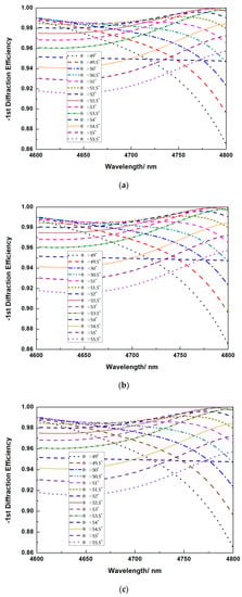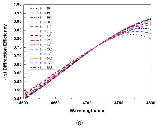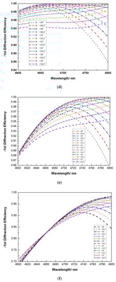 It can be seen that, if the filling factor is smaller than 0.5, there is always a certain incident angle for the total spectrum to have a high DE for over 97%, and for 4.7 μm, there is always an appropriate incident for the DE to be over 98.5%. There is always a certain angle across the 4.6 μm to 4.8 μm to have the highest DE be larger than 99.9%. Yet, for the filling factor larger than 0.5, the smallest DE at 4.6 μm drops dramatically. For wavelengths smaller than 4.7 μm, it will be hard to have a DE larger than 98% again. These simulation shows that the changes of the diffraction angle give a tougher processing tolerance, which may be caused by overexposure or ICP etching.