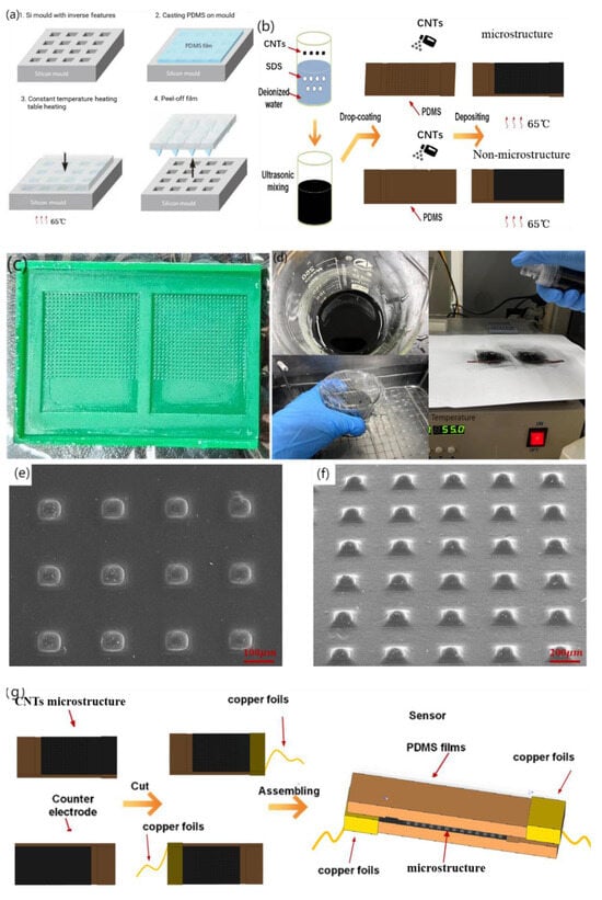After peeling, 500 mg of CNTs was weighed using an electronic balance and poured into 40 mL deionized water for ultrasonic shock for 30 min. Subsequently, 150 mg of sodium dodecyl sulfate (SDS) was added to the mixed solution as a surfactant. After ultrasonic treatment for 30 min, CNTs were fully dispersed. An ultrasonic probe was used for 30 min, and after standing, a pipette was used to collect the supernatant for later use. Subsequently, the PDMS base with the microstructure was placed into the plasma cleaner upward, so that the pressure gauge pointer of the pressure-reducing valve was between 0.1~0.2 MPa. The substrate was cleaned at 600 and 800 V for 2 min to improve the hydrophilicity of the surface and facilitate the attachment of the CNTs dispersion liquid. The treated substrate was placed on a constant temperature heating table at 80 °C, and 15 mL of CNT-dispersed liquid was placed in the spray gun. The dispersed liquid in the spray gun was evenly sprayed onto the substrate surface with a microstructure three times (5 mL each) at an interval of 15 min. After spraying, the sensor was left to stand for 20 min and then removed. A scanning electron microscopy (SEM) image of the sensor surface after spraying is shown in Figure 3e,f.