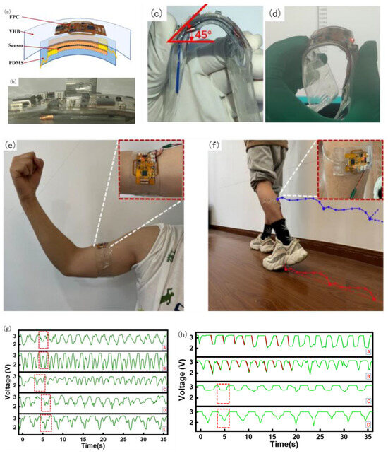 The entire device was divided into four layers: the top layer was an FPC, mainly for signal acquisition and processing, the second layer was an elastic dielectric, the third layer was a flexible sensor, and the fourth layer was a PDMS film. To facilitate wear and meet the ductility and recoverability requirements, the packaging of this device adopts the dielectric elastomer 3 M VHB (1 mm), which is sticky, malleable, and resilient. The FPC acquisition device can be tightly fitted with a flexible sensor based on the viscosity of VHB and can be bent along with the sensor and acquisition device. The sticky contact with the skin affects the state of the skin, thus affecting the accuracy of the MMG signal acquisition, and it is obviously invasive to wear for a long time. 100 um PDMS film was selected and plasma-treated to increase its adhesive viscosity with VHB. The entire device was used for the encapsulation of the measurement layer, as shown in Figure 7a.
