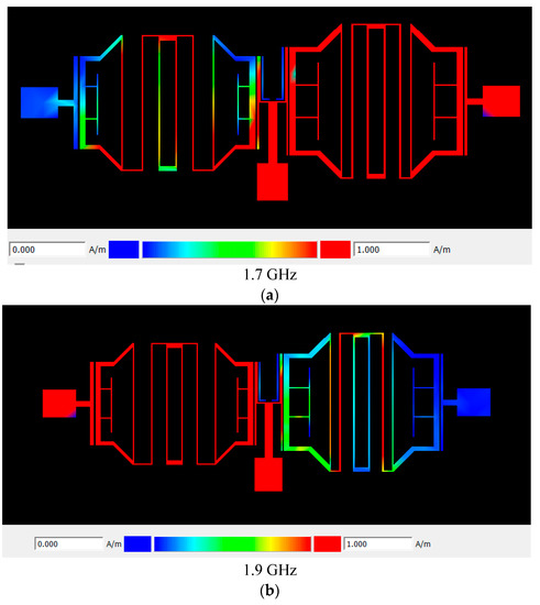 The surface current distributions in the proposed quad-band diplexer are demonstrated in Figure 15a–d. The proposed diplexer correctly works at four frequency bands of 1.7/1.9/3.3/3.6 GHz. As per the results shown in Figure 15a,c, the currents are correctly distributed uniformly at the port2 at the 1.7 GHz and 3.3 GHz frequencies and show that the currents have not reached the port3. Additionally, as seen in Figure 15b,d, the results show that the currents are correctly distributed uniformly at the port3 at the 1.9 GHz and 3.6 GHz frequencies and show that the currents have not reached the port2.