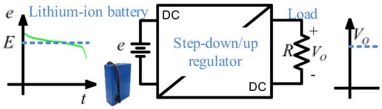 Lithium-ion batteries (LIBs) are used as power sources in electric vehicles, digital cameras, and many other portable devices such as mobile phones, laptops, and medical equipment. However, one of the most common problems is that LIBs require a connection to a voltage regulator to maintain a constant output voltage [], as shown in Figure 1. A typical case is IoT (Internet of things) devices that need a bus of 3.3 V to regulate the LIB fluctuation from 1.8 V to 5 V [], or in portable bioelectric equipment such as the cardiac pacemaker and capsule endoscopy [] where 3.6 V are regulated from a battery fluctuation of 2.5 V to 5 V. Another is the regulator based on a SEPIC converter with a switched inductor proposed in [] to maintain a fluctuating voltage of 18–24 V to a constant value of 21 V for a laptop.