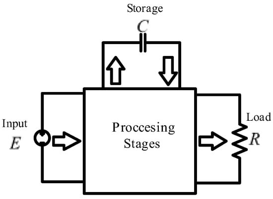 Based on the above, it is concluded that a non-cascading connection of simple converters could be a better solution. In these topologies, part of the energy is processed only by one converter; thus, they have reduced redundant power processing (r2p2) [,]. To carry out the analysis, a converter made up of two stages can be represented by three ports, as shown in Figure 2: the input port or source that supplies energy, the storage port or capacitor that stores energy but also delivers it, and the output port or load that only absorbs power.