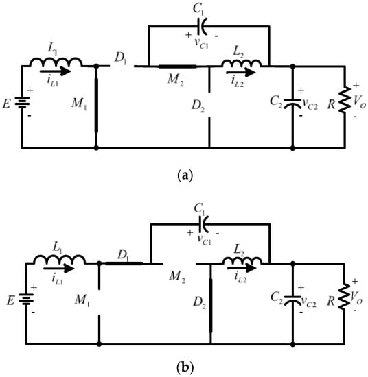 The ON state is shown in Figure 4a, for a time corresponding to DT in which D represents the duty cycle and T the period of a switching cycle of the converter, respectively; and are closed; and and are reverse biased. It is possible to identify three different parallel connections—the source with inductor , capacitor with inductor , and capacitor with load R—so both inductors charge energy, and both capacitors release energy. Thus, in this condition: