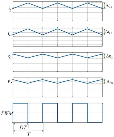 When designing a converter, specifications must be met regarding the values of the voltage ripple in the capacitors and the output voltage, as well as the current ripple in the inductors; these specifications are expressed as percentages. The voltage ripple percentage for the capacitor voltage is given by the relationship with a typical value in a conventional converter [] between 1% and 2%, and the inductor ripple percentage for the current that flows through them by with a typical value between 15% and 30%.