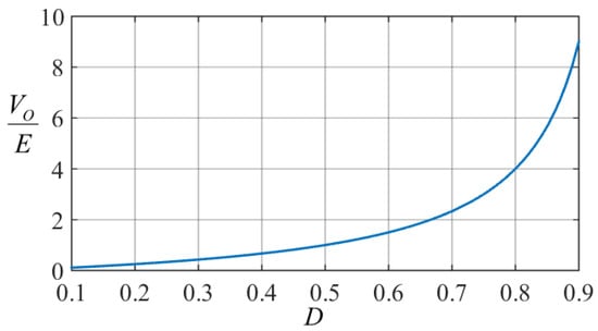 This expression is plotted and shown in Figure 6. Here, it can be observed that when 0 < D < 0.5, the converter demonstrates step-down behavior because , and when 0.5 < D < 1, the converter demonstrates step-up behavior because .