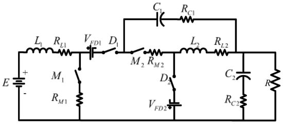 There are fifteen configurations in how to interconnect two converters with r2p2. A deep study about which configurations are feasible and non-feasible is developed using the buck, boost, and buck–boost converters [,]. Following the possible configurations, a converter based on a non-cascading interconnection with two stages is built; the first stage is a boost converter, and the second is a buck–boost converter, as shown in Figure 2. The structure can be simplified for better visualization, as shown in Figure 3, in which represents the input voltage and VO the output voltage. The transfer capacitor is represented by , and the output capacitor by . The inductor of the first stage is , and the inductor of the second stage is . The MOSFETs and are the active switches operating simultaneously; and are the diodes; and is the load.