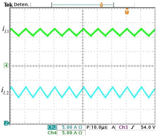 Experimental inductor currents. (From top to bottom) Inductor current iL1 (y-axis: 5 A/div) and inductor current iL2 (y-axis: 5 A/div) (x-axis: time 10 µs/div).