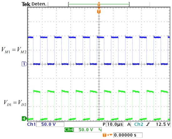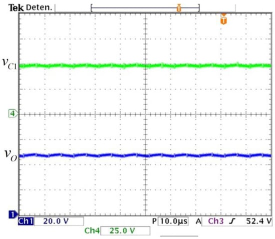 The experimental capacitor voltages are shown in Figure 12; they match the calculated values. A zoom for the voltage is measured to watch its ripple (see Figure 13) and it matches with the required 2% peak-to-peak ripple. These results validate the calculated design relationships. The experimental voltage values on the semiconductor switching devices are shown in Figure 14; they verify the expected stress calculated by the expressions obtained in Section 2.