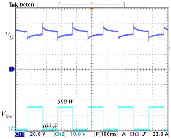 Open-loop response to step changes in the load: (top) output voltage of converter (y-axis: 20 V/div), and (bottom) gate voltage of the MOSFET that changes the load from 100 W to 500 W (y-axis: 10 V/div) (x-axis: time 100 ms/div).