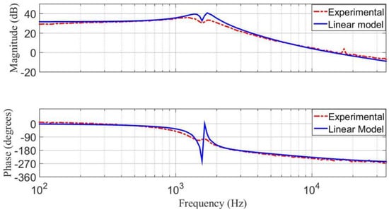 Using the Frequency Response Analyzer 300 from AP Instruments, an experimental response of the transfer function is obtained for the prototype. It is compared with the response obtained from the linear model using MATLAB software, as shown in Figure 16. The plot of the experimental response (dotted line) is smoother due to the effect of parasitic elements of the step-down/up converter. The parasitic elements were neglected in the linear model (continuous line). The similar behavior of these responses validates the approximation of the linear model of the step-down/up converter.